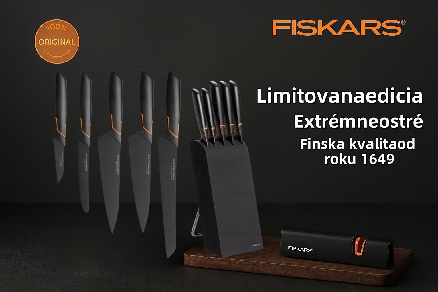 ☑️ Limitovaná edice | 5dílná sada nožů FISKARS® v bloku EDGE BLOCK – ostrý kuchyňský nůž + brusná sada