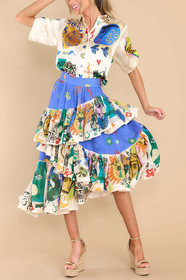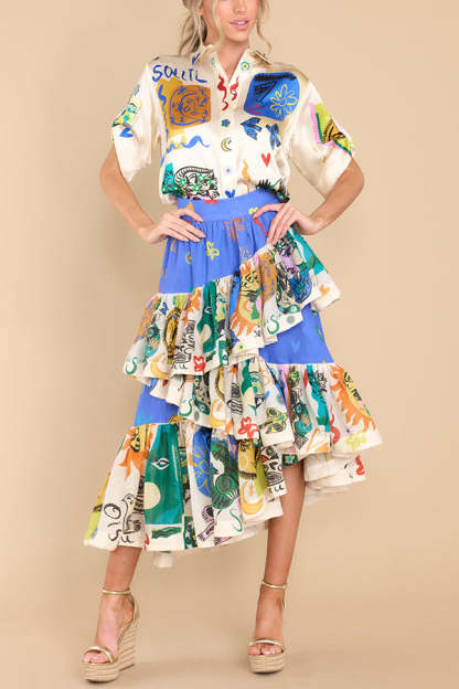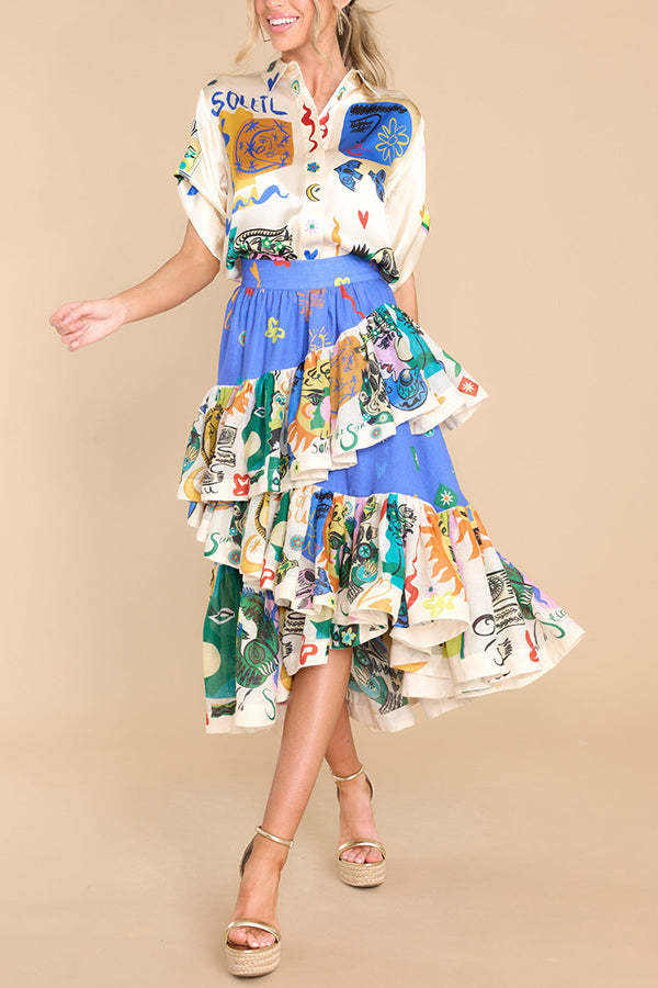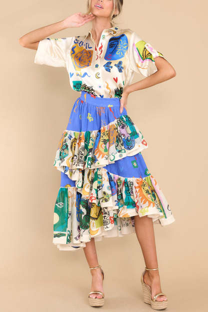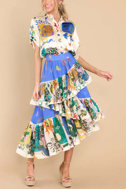 Sandy Sunshine Unique Print Irregular Ruffles Tiered Midi Skirt