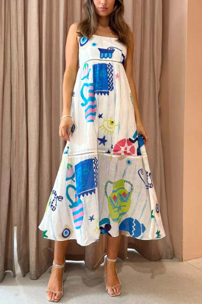 She's The Fun Linen Blend Playful Print Ladder Trim Midi Dress